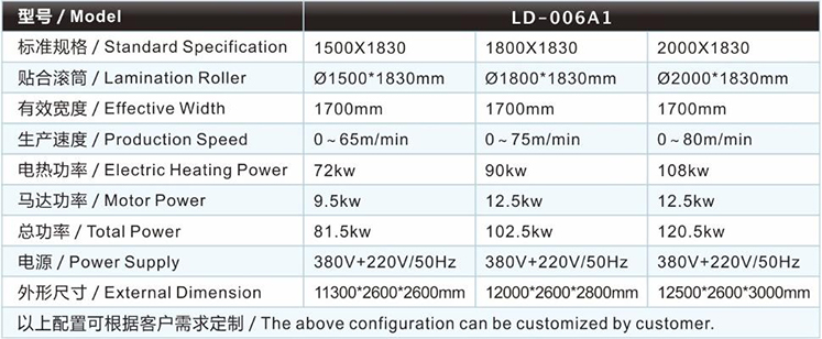 | 鞋材復(fù)合機(jī)/貼合機(jī)-臥式雙輪雙網(wǎng)單槽水膠高速泡棉復(fù)合機(jī)/貼合機(jī)LD-006A1主要技術(shù)參數(shù) / Major technical parameters |